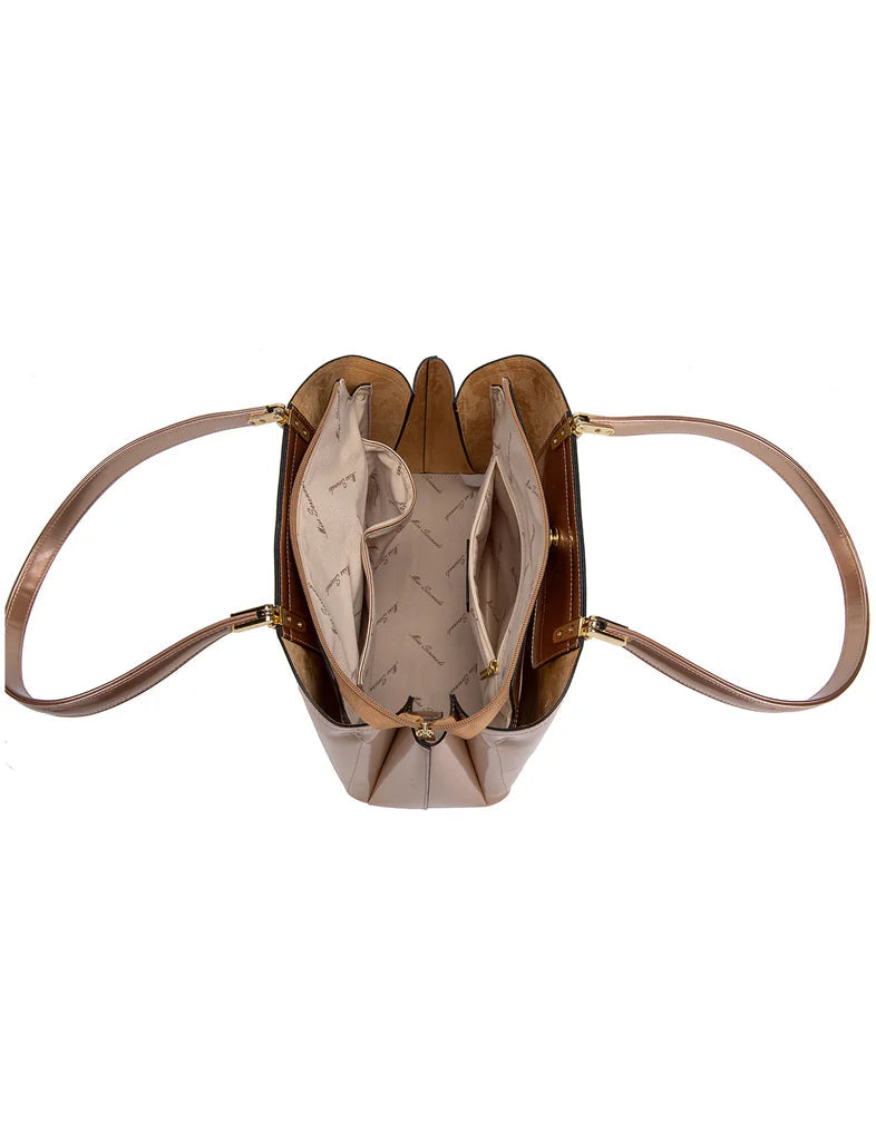 Make a statement wearing this Miss Serenade Sofia bag, designed with patent finish vegan material. Sofia has a main central zippered compartment plus 2 additional magnetic closure compartments that snap close with ease. The main compartment has twin slip phone compartments and one internal zippered compartment, this bag is guaranteed to keep you organised.